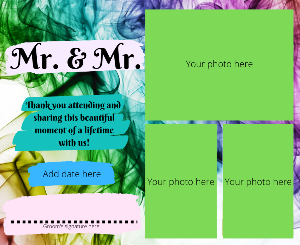 Stand out at your wedding with this thank you card to add your personal photos to and sign after you get them printed off. Make your wedding day as special as everyone else and leave that lasting impression for everyone to remember your special day.